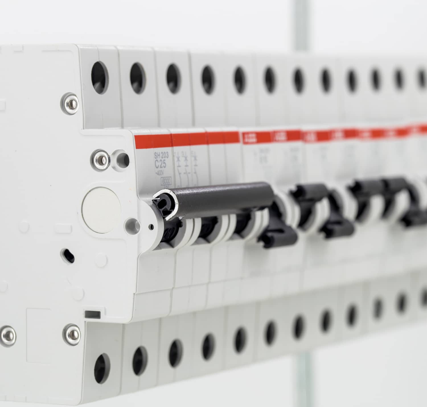 Nu verwijderen we de afdekplaatjes aan de voorkant van de groepenkast, zodat we de extra groep kunnen aanleggen. Vervolgens sluiten we de groepenkast weer, draaien de hoofdschakelaar om en testen de nieuwe zekering. We controleren of de spanning van de nieuwe leiding wegvalt wanneer de schakelaar naar beneden wordt getrokken.